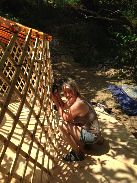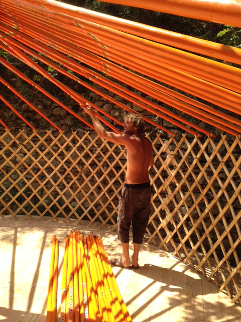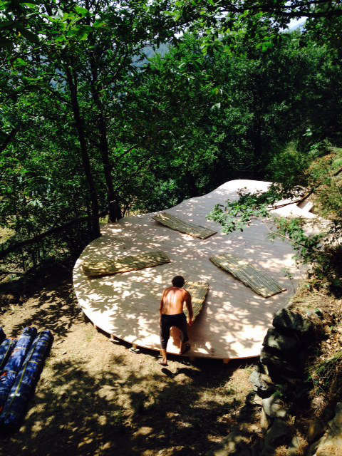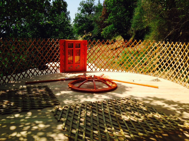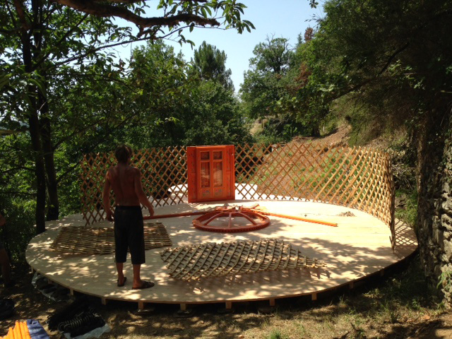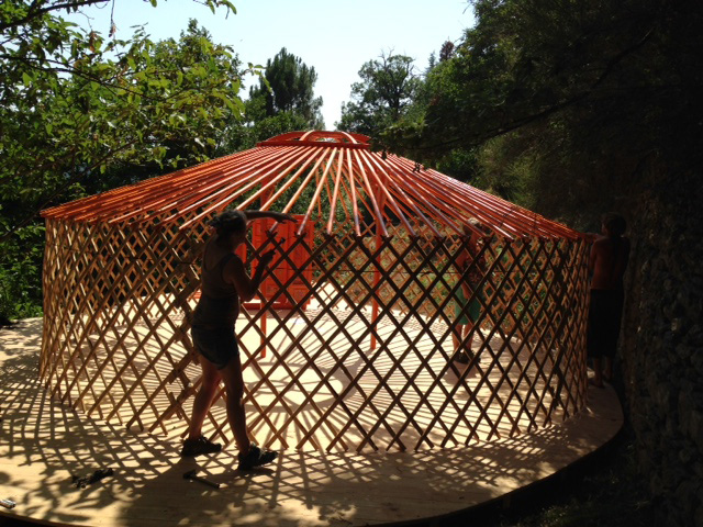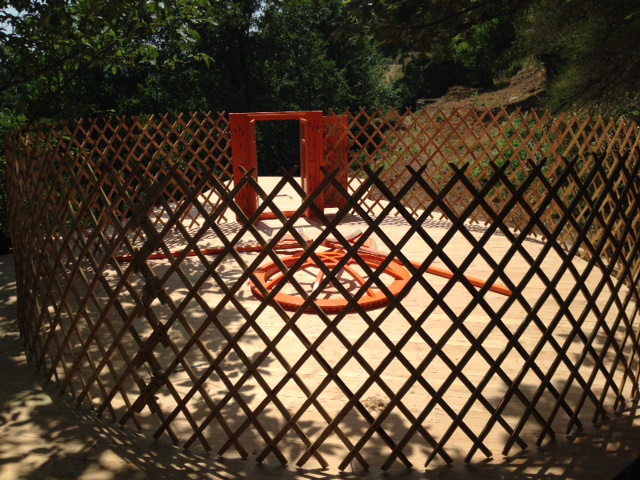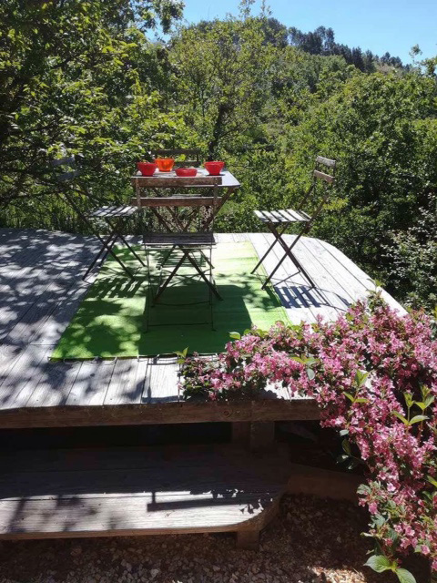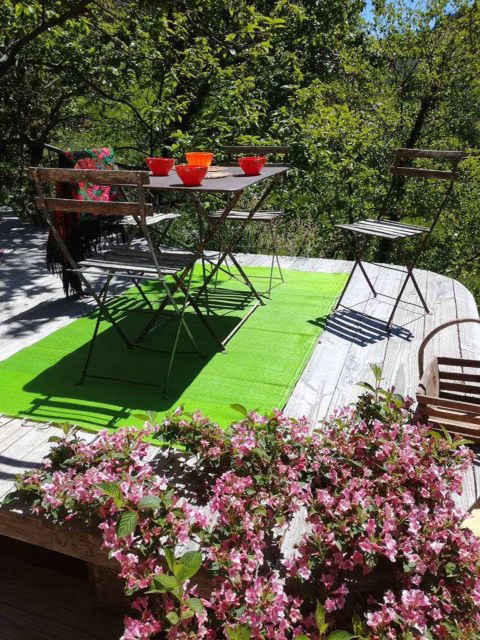 Installée sur une grande terrasse ensoleillée, l'emplacement de cette yourte bénéficie d'une vue dégagée sur l'espace naturel et la végétation qui l'entourent au fond du jardin.